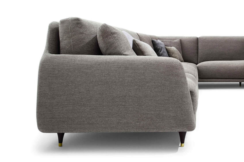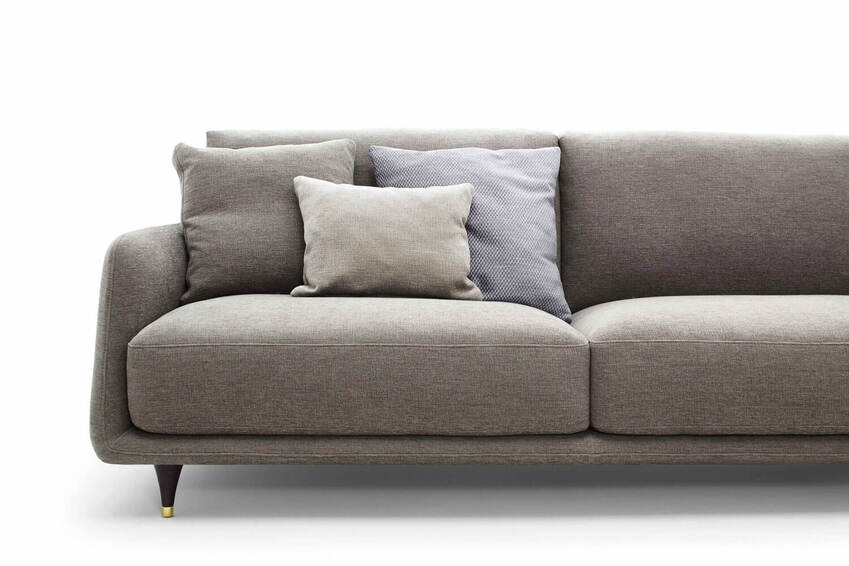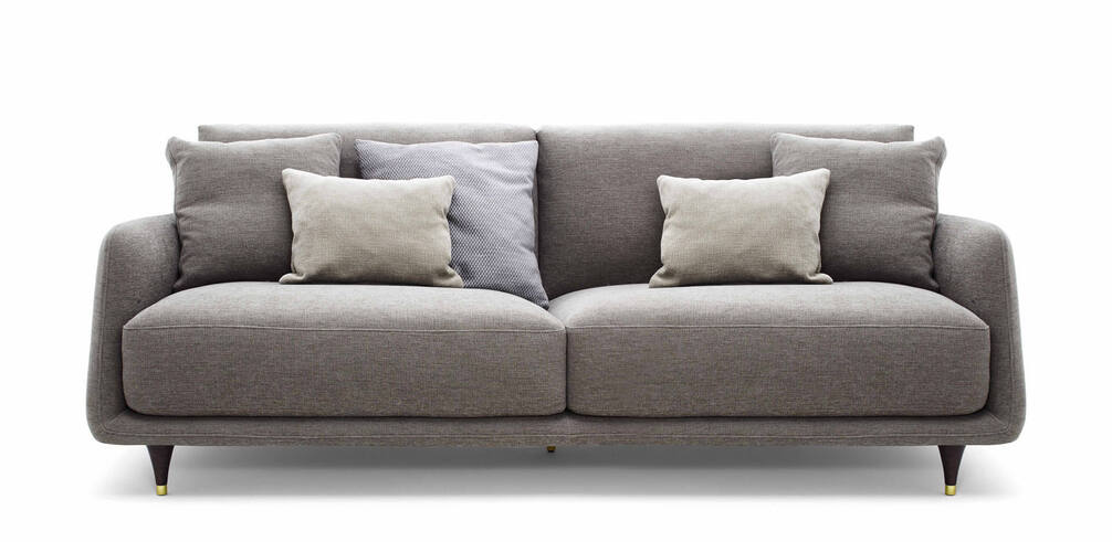 Диван элегантной и простой формы с деталями, характерными для стиля ретро, такими как мягкие изгибы подлокотника, сливающегося со спинкой, и деревянные ножки с латунными наконечниками.