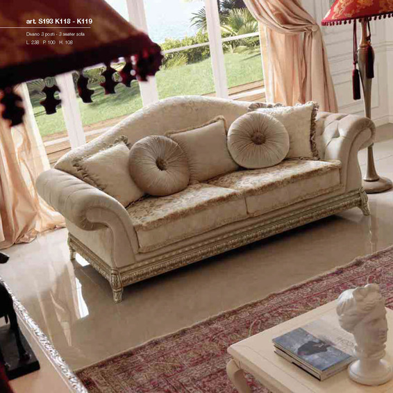 Диван с классическим характерным вкусом с деревянной основой и гармоничной формой спинки и подлокотников. В комбинации подушки различной формы, покрытые тканью и тонкой отделкой.