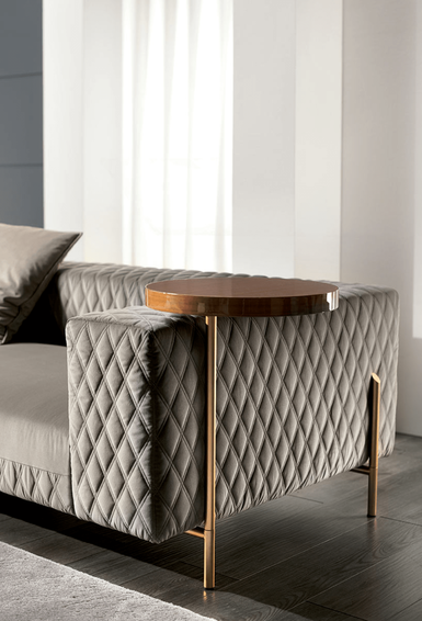 Угловой модульный диван на основании из металла. Каркас выполнен из массива дерева. Имеет встроенные аксессуары: столик-подставку из древесины и лампу с тканевым абажуром (аксессуары могут быть установлены на каждую ножку дивана). Обивка изделия выполняется из ткани или кожи разных видов. Возможны иные композиции дивана.