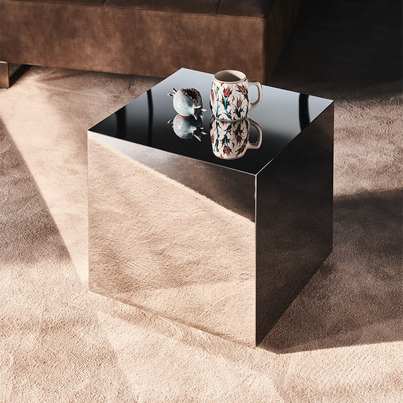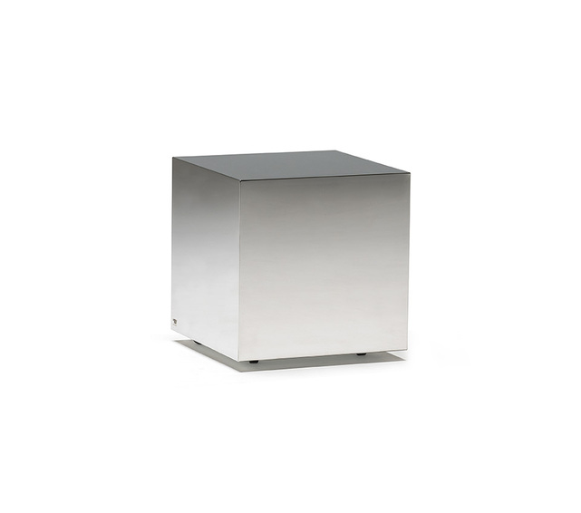 Куб с колесами из полированной нержавеющей стали. Небольшие неровности отражения обусловлены ручной обработкой. Доступен в квадратной форме и в размерах: 40x40x43h