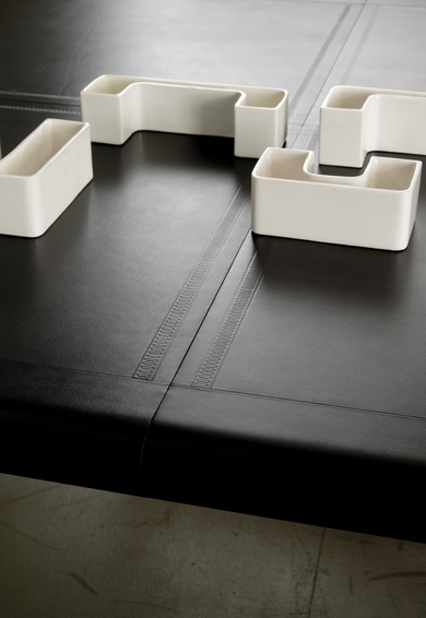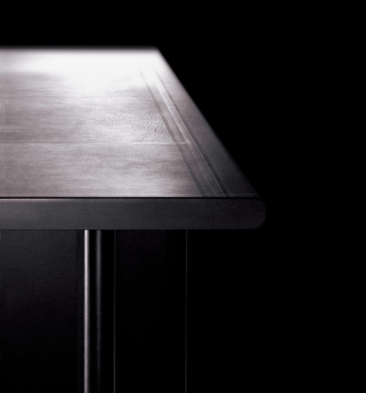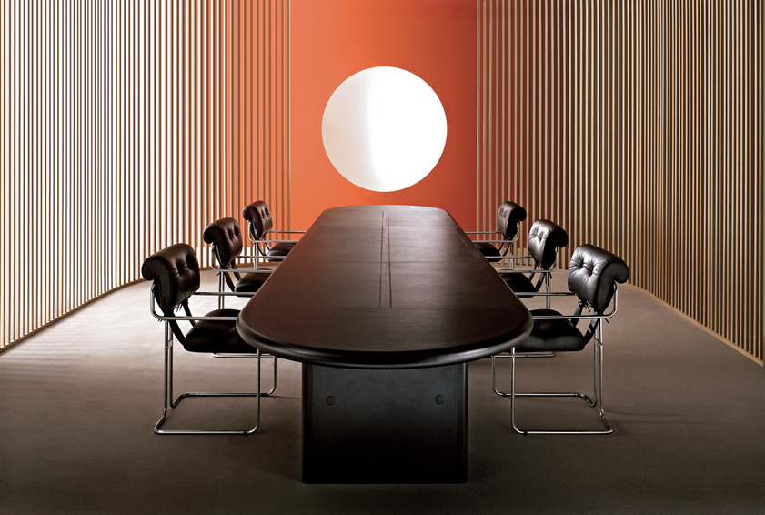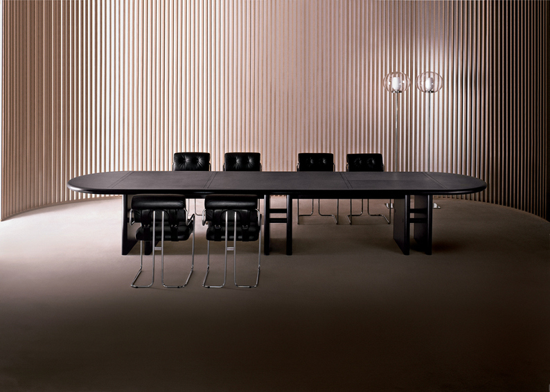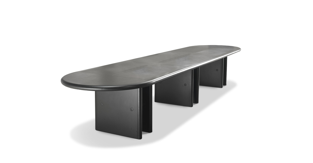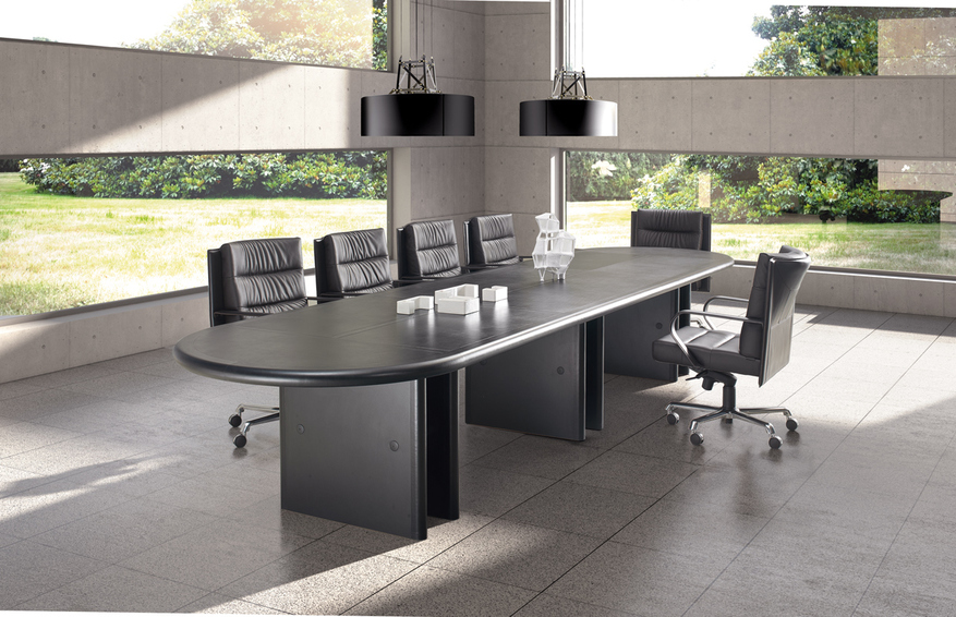 Столешницы и ножки конференц-столов изготовлены из сотового картона с краями и перекладинами из бука, сотовый материал 35 мм. и две панели по 10 мм с двухсторонним покрытием из МДФ или черного меламина. Округлые края всегда обтянуты шорно-седельной кожей, а верх может быть из шорно-седельной кожи, шпонированной древесиной или ламината черного цвета.