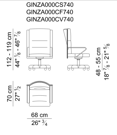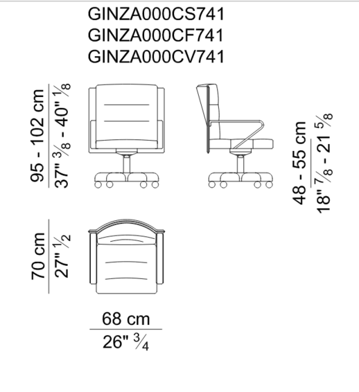 Серия GINZA включает кресло руководителя и кресла для конференций с основанием на роликах и пятилучевой крестовиной, и стулья на двух ножках и двух колесиках, прикрепленных к спинке.