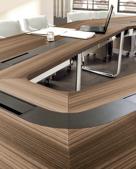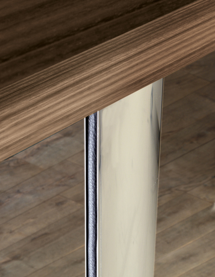 Столешница изготовлена из ДСП толщиной 35 мм, покрытого шпоном эвкалипта, с центральной полосой, обтянутой шорно-седельной кожей; вдоль этой полосы расположено 10 выдвижных ящиков (каждый из которых содержит 2 универсальных розетки, 2 USB, 1 Audio 3.5, 1 HDMI, 2 RJ45), а под ним — стальной канал для прокладки кабеля; кабели исключены. Ножки изготовлены из тянутого алюминия, изогнуты и окрашены под хром. Конечно, эта модель полностью настраивается как по размерам, так и по материалам и аксессуарам. Модель доступна в стандартной комплектации в том виде, в котором она представлена, с размерами 620 × 294 см и отделкой из эвкалипта в сочетании с кожей.