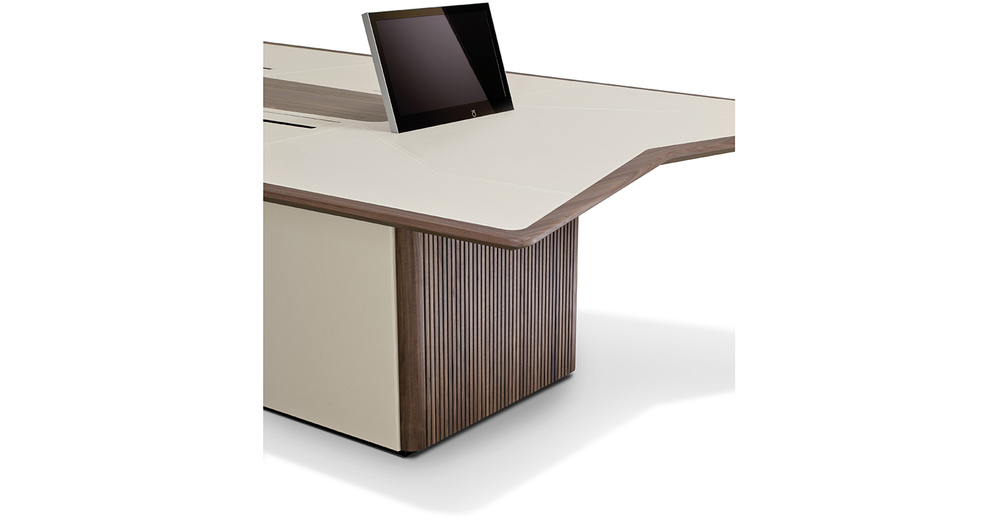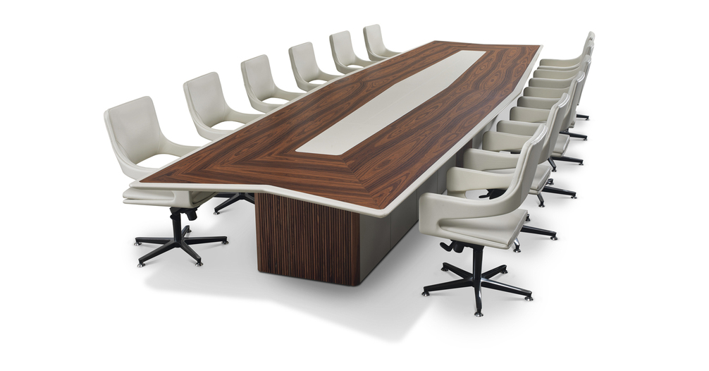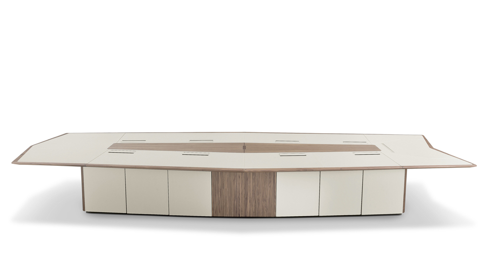 Предмет мебели, который декларирует свой характер с первого взгляда. Это «Мастер», стол для переговоров, который, как объясняет архитектор Аснаго, «выделяется своей асимметричной формой, которая четко указывает на положение команд в концевых частях». Характеризуется внешним краем из серого окрашенного массива черного ореха и верха, который чередует седельную кожаную часть с центральной частью из дерева, в основании сочетаются кожаные двери и фиксированные элементы из массива серого черного ореха. Многие детали делают Master эффективным рабочим инструментом: он полностью подготовлен для прокладки кабеля под верхом и готов к осмотру, сверху он имеет 8 электрических коробок, оснащенных разъемами питания и данных, в дополнение к возможности установки усовершенствованного выдвижного монитора скрытого монтажа. , В дополнение к стандартной версии, таблица полностью настраивается для размеров и отделки.