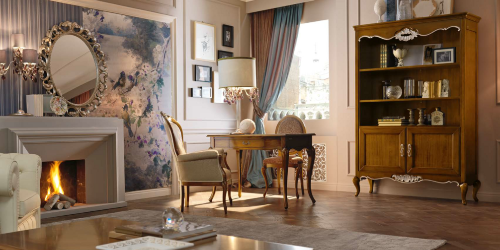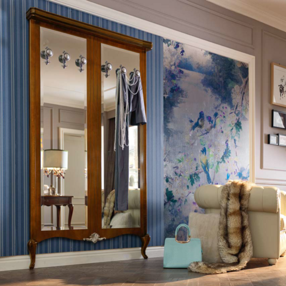 Это решение обновляет теплые тона натурального дерева в вешалке со встроенным зеркалом, письменным столом и элегантным курительным столиком, украшенным изысканной серебряной резьбой.