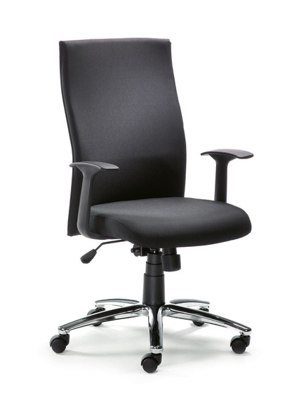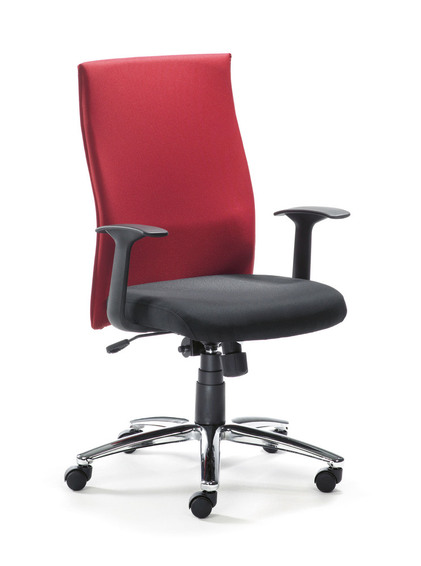 Мягкое сиденье и спинка, поясничная опора, фиксированные черные пластиковые подлокотники, синхронный механизм с индивидуальной регулировкой веса, хромированная звездчатая основа, включая колесики для ковров Выбор чехлов для сиденья / спинки: 21 = черное сиденье, красная спинка 27 = черные сиденье и спинка