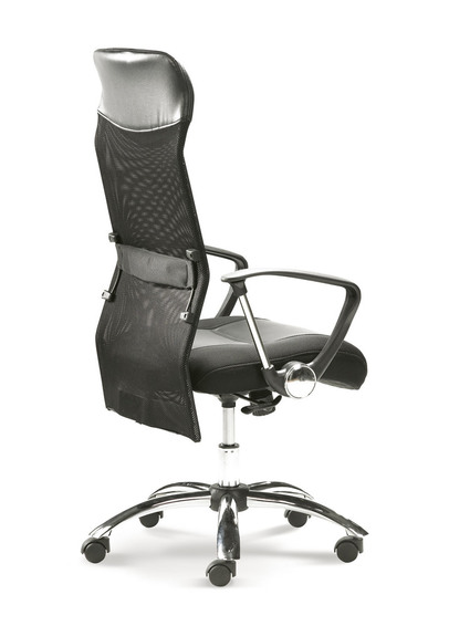 Кожаное сиденье, сетчатая спинка, регулируемая поясничная опора, фиксированные подлокотники, механизм релаксации с индивидуальной регулировкой веса, хромированная звездная основа, включая колесики для ковров
