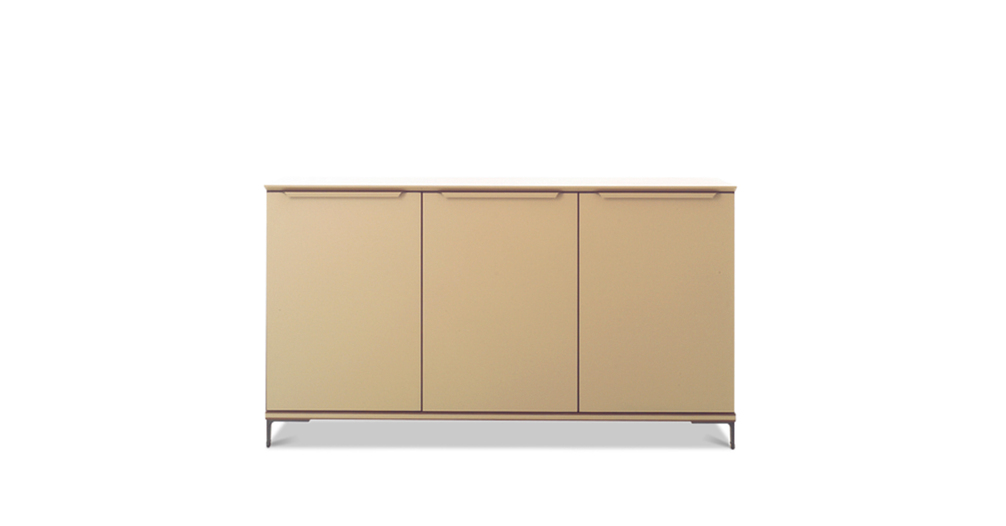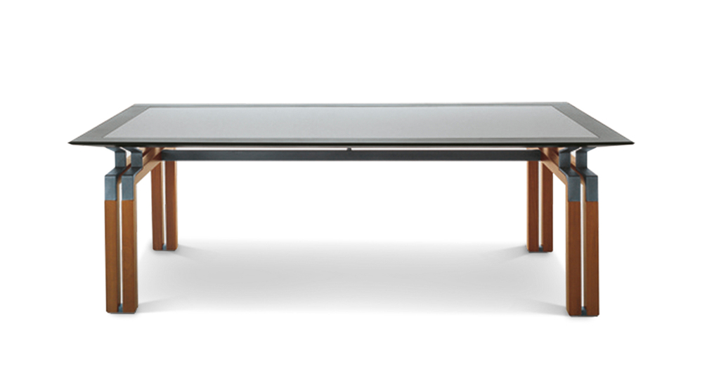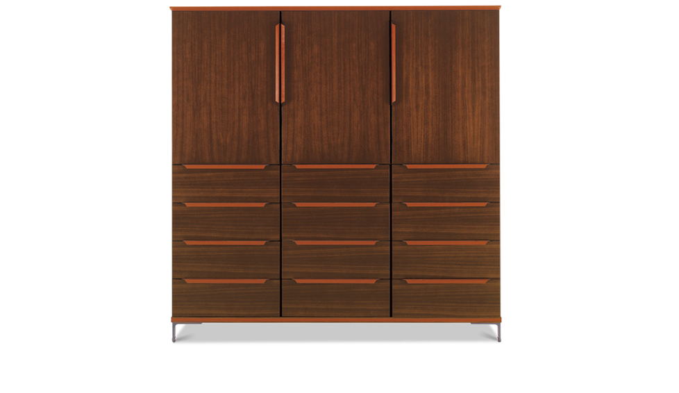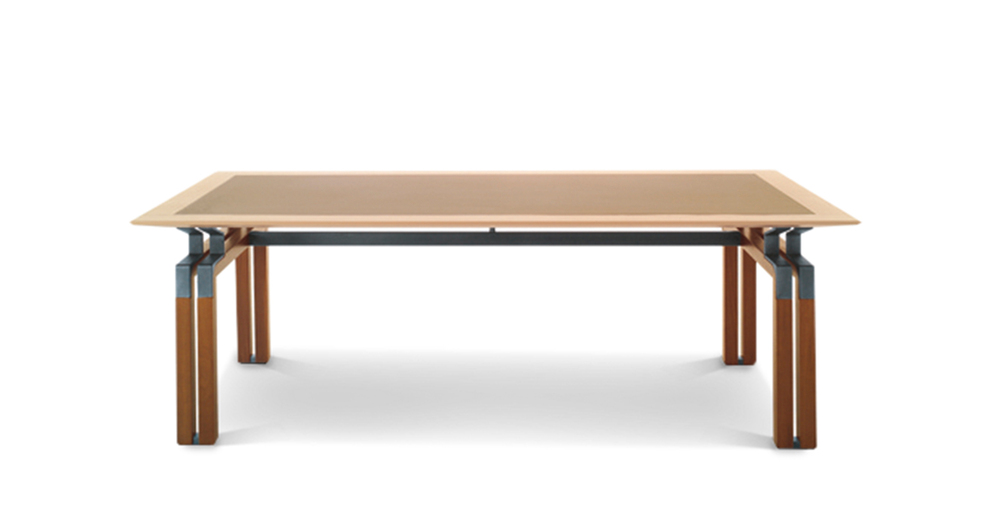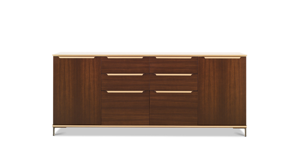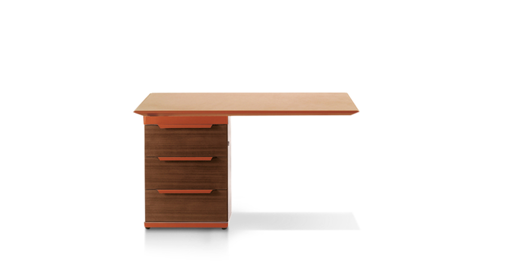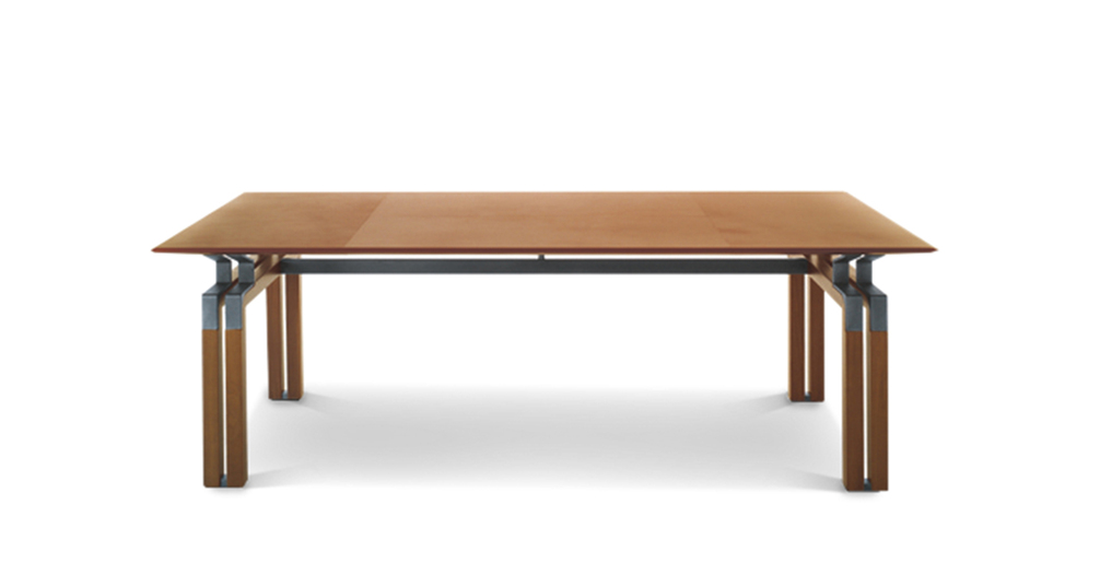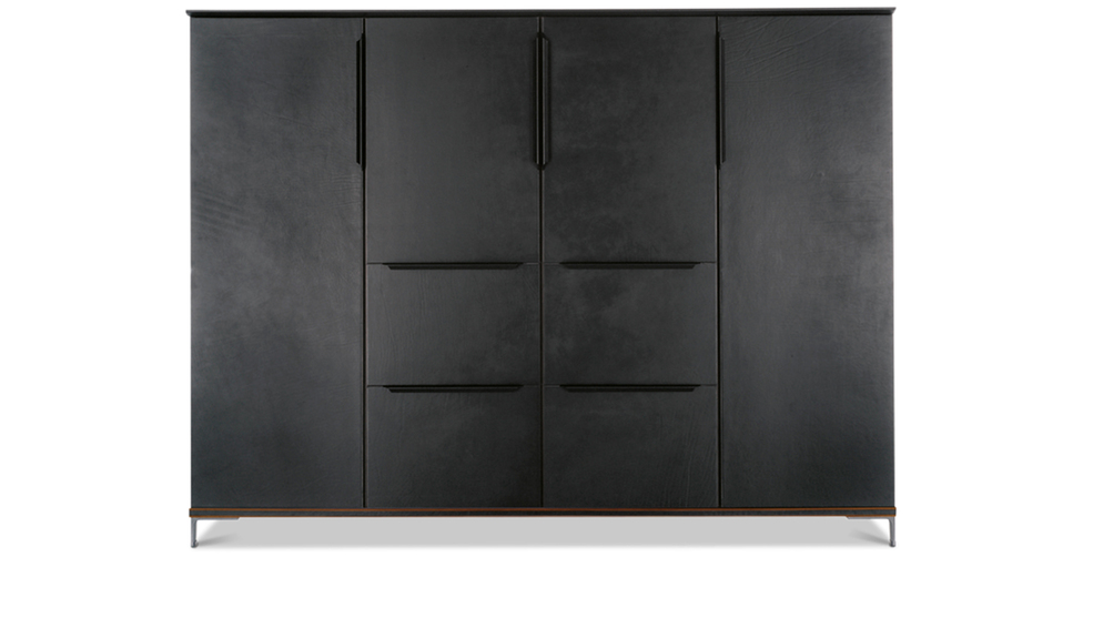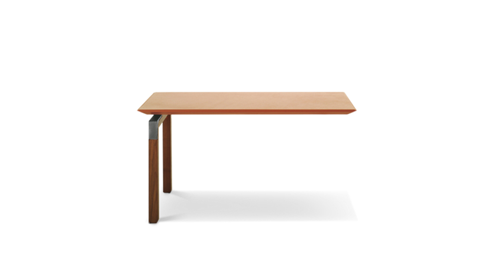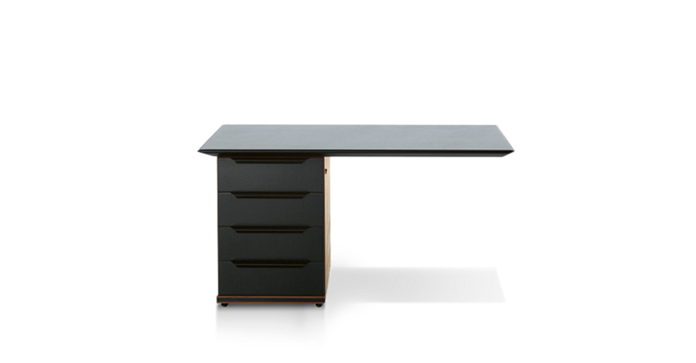 «Определенная настойчивость», повторение, раздвоение, уменьшение компактной, в то же время более массивной ножки по сравнению с каркасом, с краями, с собственными линиями. От стоек идут металлическоие кронштейны, они также раздваиваются и спрофилированны в соответствии с ломанной линией, что делает столешницу легкой и подвешенной: своего рода висящая в воздухе поверхность при необыкновенно прочной и архитектурно оформленной нижней конструкции. Вся геометрия и тонкие пропорции простых форм, образующих эту коллекцию, глубоко продуманны, сверхпроконтролированны, спроектированны, в то же время сохранены свои точные правила. Как в танце, несмотря на кажущуюся естественность шагов, движения следуют своего рода ритуалу заранее установленных схем, повторяющихся до бесконечности, также и здесь предметы мебели, отделения шкафчиков состязаются в повторении и воспроизведении. «Формальное подражание» используется в качестве средства, чтобы понять смысл коллекции и обратить на нее все внимание Повторяющийся элемент заключается, таким образом, в тонкой и длинной ручке из согнутой кожи. Шорно-седельная кожа, черный орех и металл — вот основные материалы этого «двойного шага» — Paso Doble (пасодобля), танца форм, где легкость и правила постоянно пересекаются, не мешая друг другу.