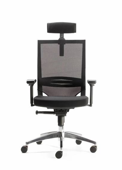 Сиденье с обивкой из ткани и спинка из черной сетки, регулируемая по высоте и наклона опора для шеи, регулируемая по высоте поясничная опора, регулируемая по высоте и глубине, поворотные подлокотники с мягкими чехлами из полиуретана, синхронный механизм с индивидуальной регулировкой веса и регулировкой глубины сиденья, полированная алюминиевая основа, включая большие колесики для ковров