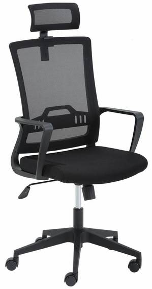 высокая сетчатая спинка, сиденье с тканевой обивкой, регулируемые поясничная опора и подголовник, синхронный механизм с индивидуальной регулировкой веса, черная пластиковая основа, включая универсальные ролики, также подходят для твердых полов