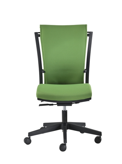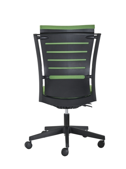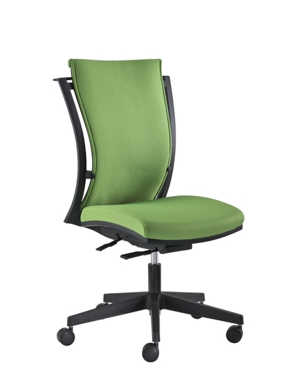 Мягкое сиденье и спинка, регулируемая поясничная опора, саморегулирующийся синхронный механизм с регулировкой глубины сиденья, черная пластиковая основа, большие универсальные ролики, также подходящие для твердых полов