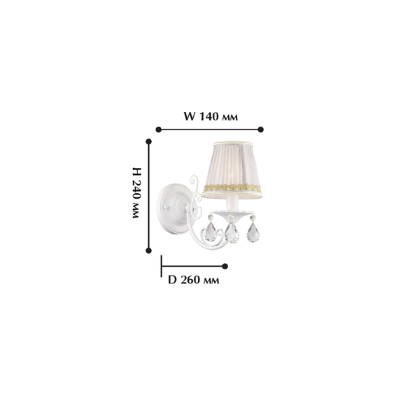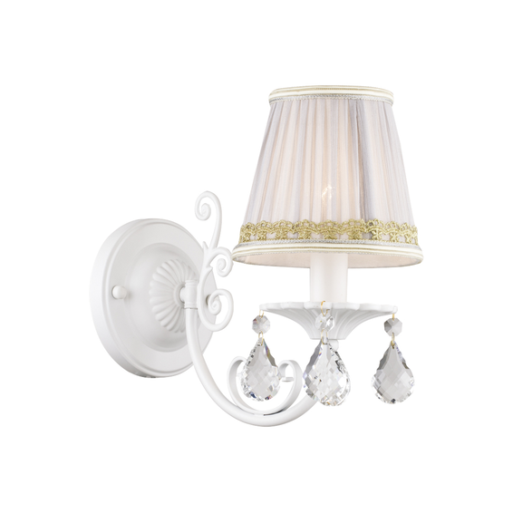 Каркас изготовлен из металла белого цвета, абажур из белой хлопковой ткани с узорной золотистой тесьмой, хрустальные подвески высшего качества.