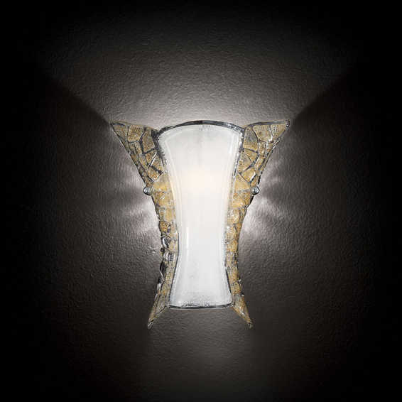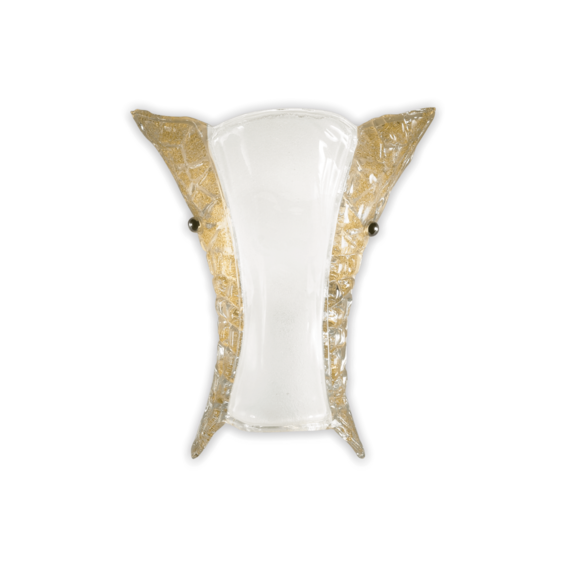 Рассеиватель из прозрачного стекла сделанного на раскалённом листе с белыми песчинками в центральной части и янтарными по бокам. Закрепляющие плафон винты хромированного цвета.