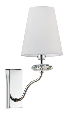 Каркас изготовлен из металла в хромированном цвете, абажур из текстиля и пластика белого цвета, хрустальные подвески прозрачного цвета. Доступен в цвете золотас бежевым абажуром - ARMANDO AP1.1 GOLD 0181/401.1.