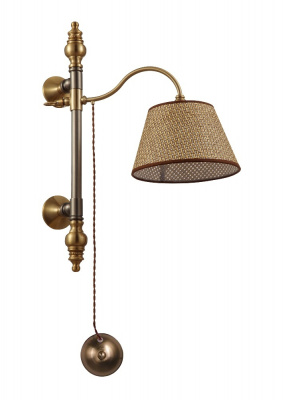 Каркас изготовлен из металла, окрашенного в цвет бронза, абажур коричневого цвета из пластика и текстиля, прозрачные подвески из стекла.