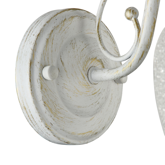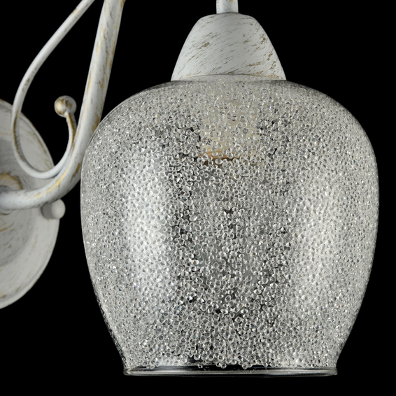 Плафоны светильников выполнены технике стекла с эффектом заморозки, а арматура причудливо изогнута. Еще одно украшение светильников – декоративная чашка, украшенная лепниной. Благодаря компактным размерам светильники подходят для помещений с невысокими потолками.
