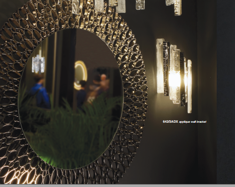 "Каркас на тросах из металла, прозрачное пулегозо и кованое муранское стекло в сочетании с лезвиями из светлого золота, черного никеля и металла. Доступен в металле: светлое золото, черный никель, чистая сталь. "