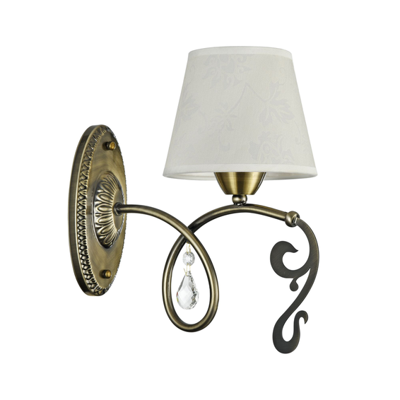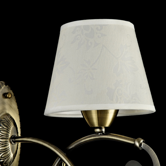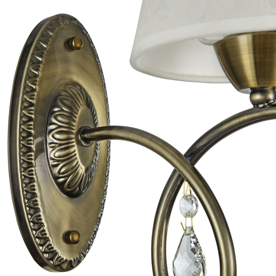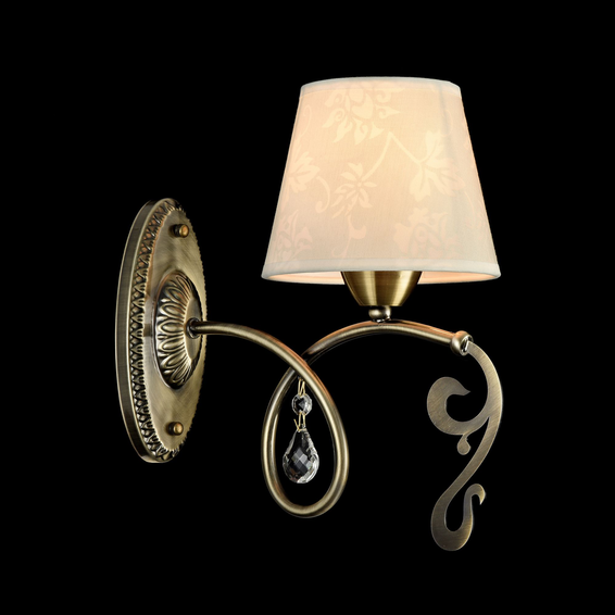 Арматура светильников выполнена из бронзы, абажуры — из ткани и ПВХ. Дизайн светильников с затейливо изогнутой арматурой и подвесками в форме шаров.