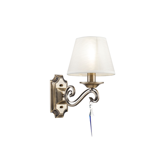 Абажуры сделаны из полупрозрачной ткани цвета «шампань», которая сочетается с цветом арматуры (бронза). Благодаря жаккардовому рисунку на абажурах создается иллюзия перламутра или легкой дымки. Светильники украшены изящными вытянутыми подвесками.