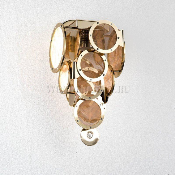 Арматура светильника сделана из металла. Металлическая рама доступна в разных цветах. Декоративные круги со стеклом прозрачного и медного цветов.