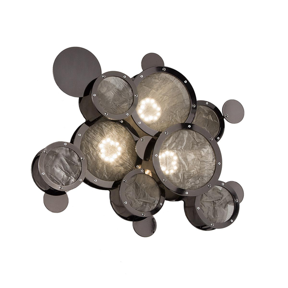 Арматура светильника сделана из металла. Металлическая рама доступна в: алюминий,светлое золото,черный никель,белый бархат,ржавчина. Декоративные круги со стеклом прозрачного и медного цветов.