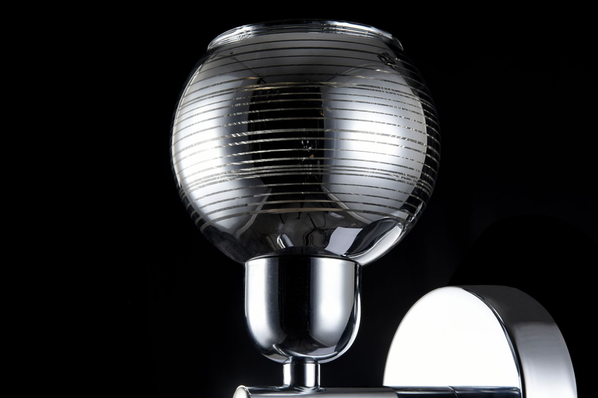 Каркас из металла цвета «хром», с декоративным элементом в виде узла и с круглыми плафонами из стекла, окрашенного под металл с орнаментом из тонких полос.