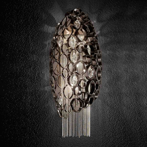 Каркас изготовлен из металла, декоративные элементы - кристаллы Сваровски и подвесные цепочки из никеля. Доступен в следующих цветовых вариантах отделки: светлое золото, чистая сталь, полированная слоновая кость, черный баклажан, черный никель.