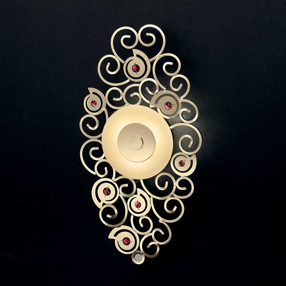 Каркас изготовлен из металла, в виде ажурной сетки, с декоративными элементами Swarowski Crystals. Доступен в следующих сочетаниях: хром и черные подвески, светлое золото и красные подвески, бронза и янтарные подвески.