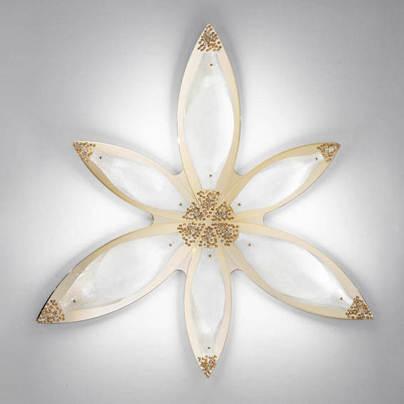 Каркас изготовлен из металла, окрашенного в цвет золота, плафоны из белого муранского стекла, с декоративными элементами из кристаллов Swarovski.