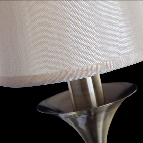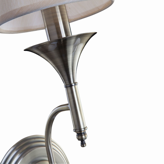 Изящно изогнутая арматура сделана из металла цвета античной бронзы. Абажуры в форме конусов выполнены из бежевого текстиля на ПВХ.