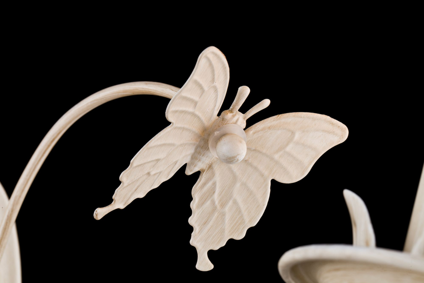 Розетки светильников выполнены в форме цветков и украшены листиками, а декоративные элементы, на которые крепятся порхающие бабочки, кажется, вот-вот повторят траекторию их полета.