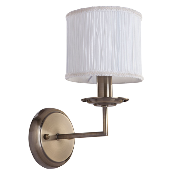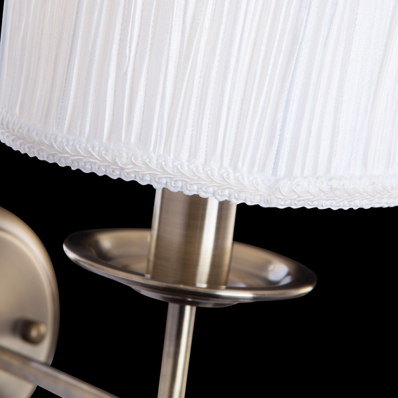 Арматура из металла цвета бронзы дополнена элементом из стекла. Белые абажуры из гофрированной органзы с тесьмой в тон ткани.