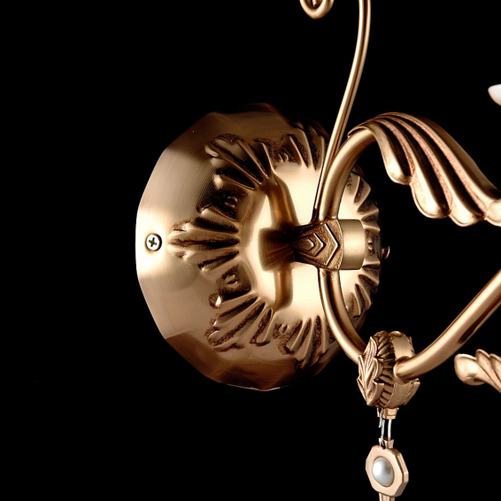 Арматура из металла. Абажур из ПВХ покрыт коричневой тканью. Искусственный жемчуг в подвесках.