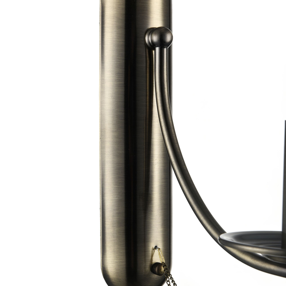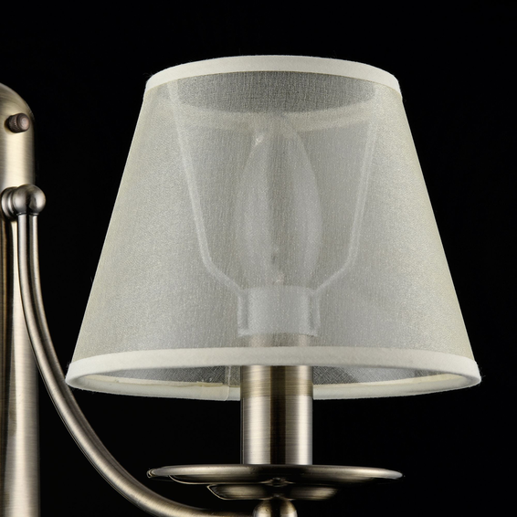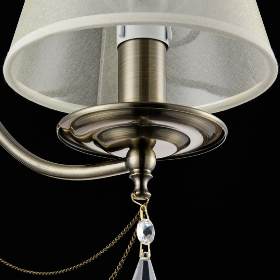Абажуры светильников – из светлой органзы и хлопка, а арматура – из металла бронзового цвета. Дизайн изделий дополнен тонкими декоративными цепочками и изящными кристаллами.
