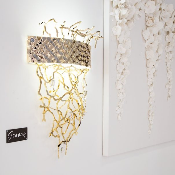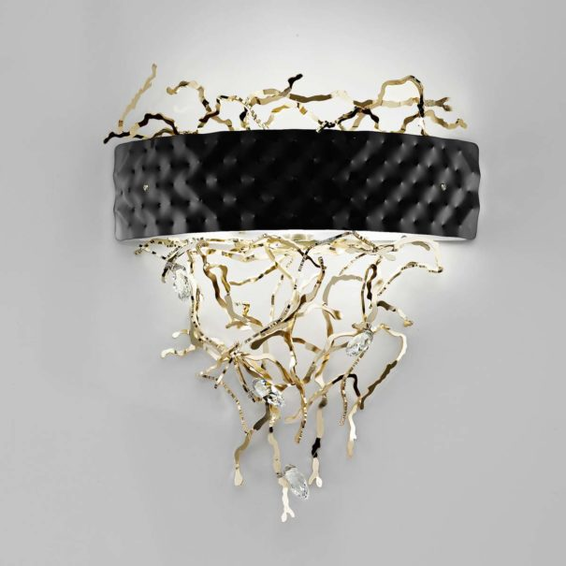 Каркас изготовлен из металла, декоративные элементы и подвески из кристаллов Swarovski. Доступен в следующих цветовых сочетаниях: белый матовый и светлое золото или сталь; черный матовый и светлое золото или сталь; черная фольга и светдлое золото или сталь; светлое золото; сталь.
