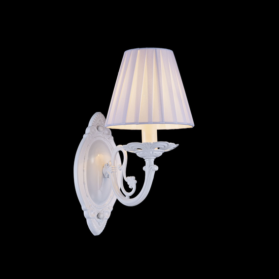 Рожки украшены резным флористическим орнаментом, абажуры сделаны из белой полупрозрачной плиссированной ткани. Светильники серии подходят практически для любых помещений: от кухни до гостиной или спальни.