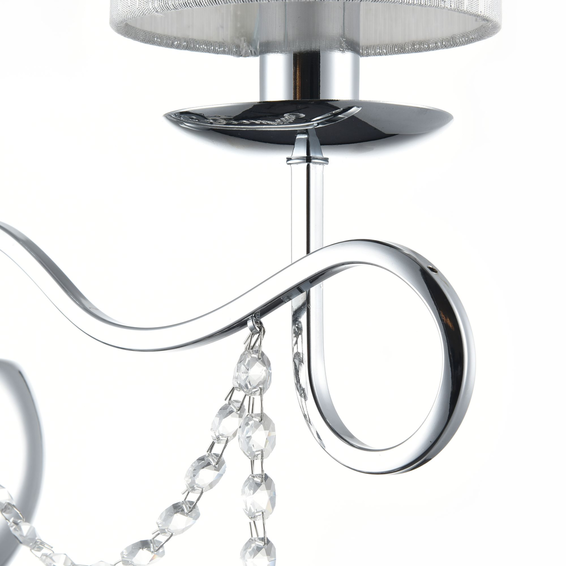 Светлые абажуры сделаны из органзы, арматура – из металла цвета "хром". Каждый из светильников этой серии декорирован хрусталем в виде лент из кристаллов в форме октагонов и шара