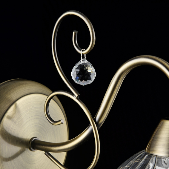 Арматура светильников сделана из металла бронзового цвета и причудливо изогнута (дань классическому стилю), а также декорирована кристаллами. Двойные плафоны из стекла разных обработок.