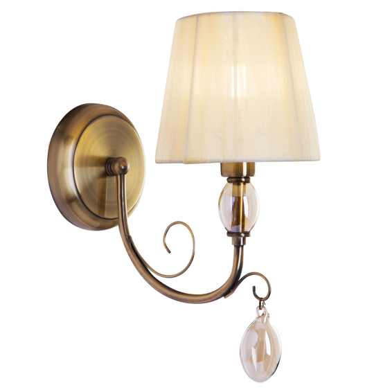 Бронзовый цвет арматуры сочетается с бежевыми абажурами и декоративными подвесками с эффектом перламутра. Арматура сделана из металла, а абажуры в виде конуса - из органзы.