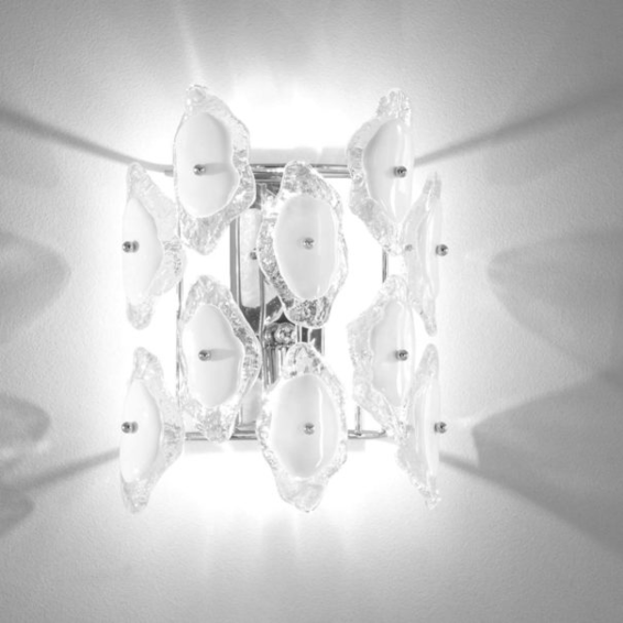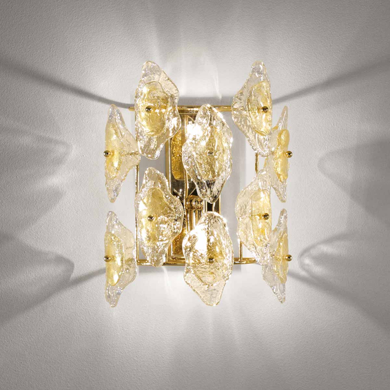 Каркас из металла хромированного или легкого золота.Светильник декорирован муранским стеклом разного цвета:прозрачный черный декорированный,прозрачный белый декорированный,прозрачный золтой декорированный.
