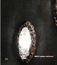 Каркас изготовлен из металла, с отделкой из прозрачного муранского стекла. Доступен в цветах: глянцевое античное золото, светлое золото, чистая сталь.