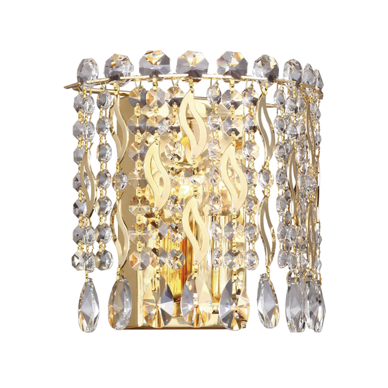 Корпус светильника из металла, покрытый золотой гальваникой,подвески из прозрачного хрусталя высшего качества.Доступен в хроме код- 2049-1W.