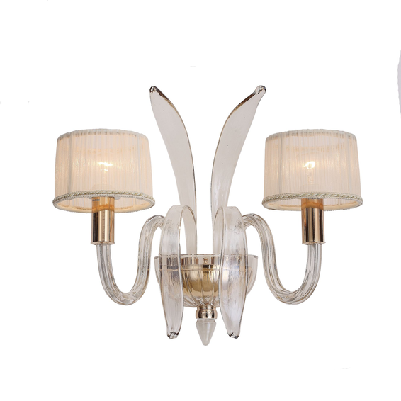 Каркас светильника из металла, покрыт гальваникой золотого цвета, стеклянные выдувные элементы цвета шампанского, абажуры из бежевой органзы.