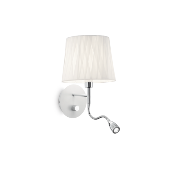 Арматура из металла окрашена белой матовой краской. Абажур из тканевой ленты. Бра с выключателем контролирует отдельно два потока света.