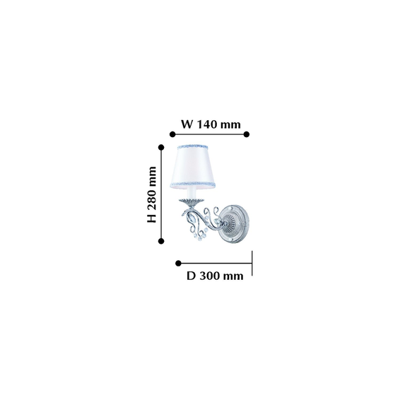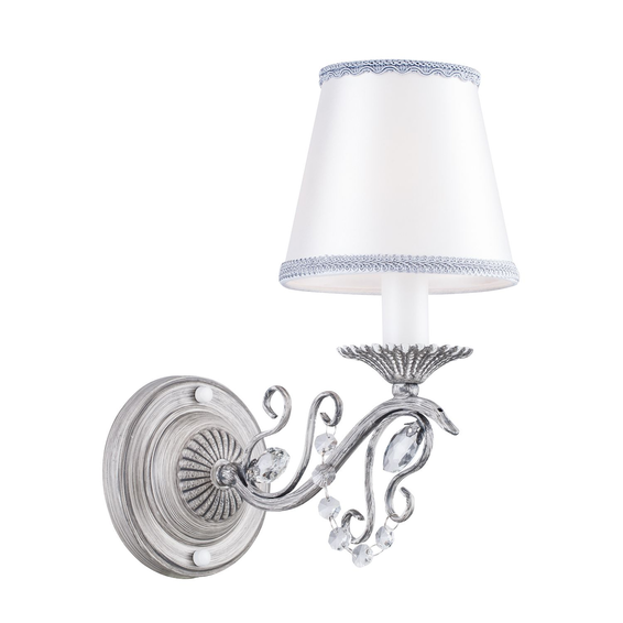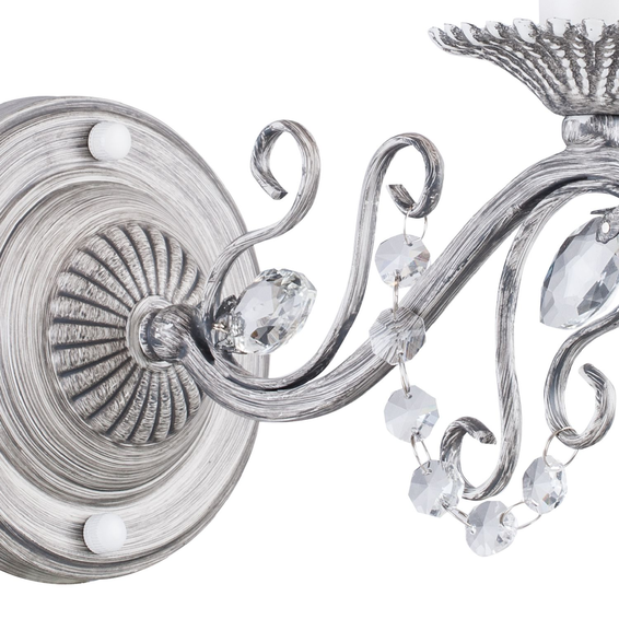 Основным цветом каркаса является серый матовый цвет, покрытый белой патиной. Абажуры из атласной ткани декорированы серой тесьмой подвесками из хрусталя.