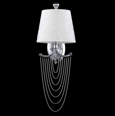 Каркас изготовлен из хромированного металла, абажур из белой ткани, декоративные металлические цепочки и хрустальная подвеска.
