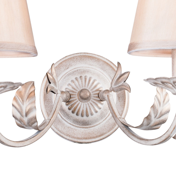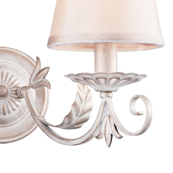 Каркас светильника из металла, окрашен в белый с густой жемчужно-золотистой патиной. Атласные абажуры кремового оттенка.