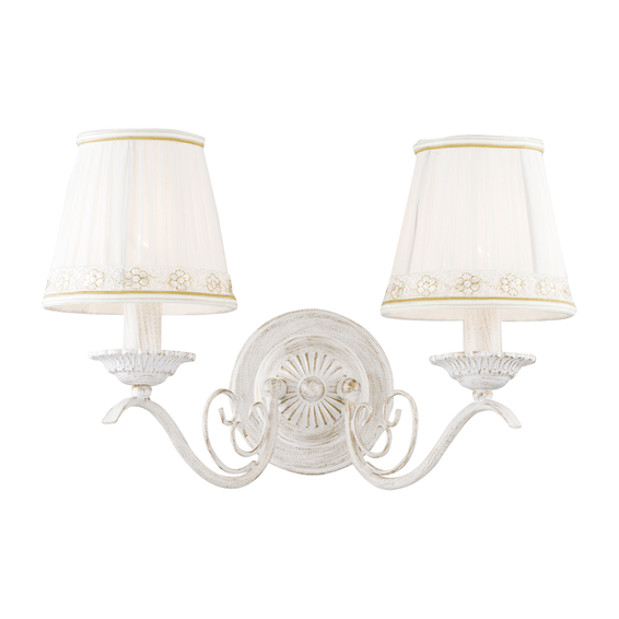 Каркас светильника из металла,окрашенный в белый цвет с золотой патинрой,абажур из белой ткани украшен декоративной тесьмой с золотистым узором.