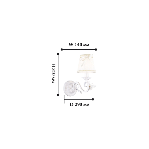 Каркас изготовлен из металла, окрашенного в белый цвет с золотой патиной, абажур из ткани цвета слоновой кости, украшен тесьмой с золотистым узором.