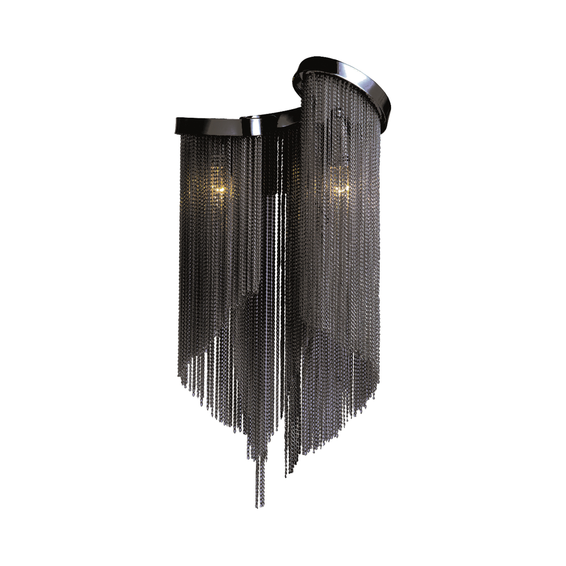 Арматура и крепежные элементы выполнены из металла в хроме. Петли хромированной ленты несут на себе белые металлические цепочки, образующие волнистый каскад оригинального абажура.Доступен также в черном хроме код-1157-2W.